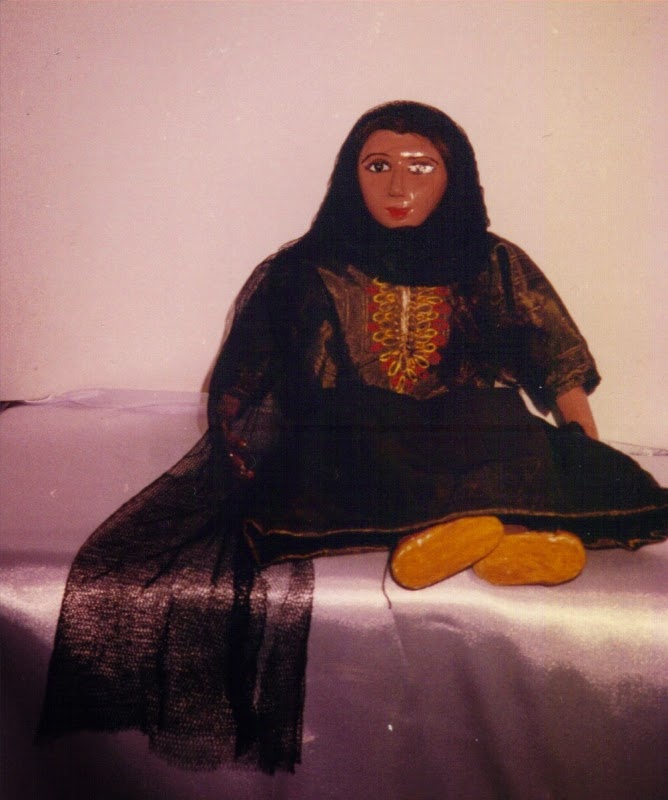 Fateema featured on some of my TV shows for children / Kuwait TV and accompanied me on dolls workshops and seminars. Her body is made of stuffed cotton. Head , arms and legs are made of air drying painted and varnished clay. The is made out of a nylon wig. I made it about 20 years ago.